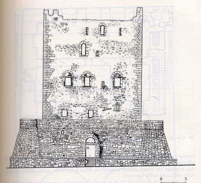 Il pianterreno è costituito da due ambienti, che presentano tre campate ciascuno, divisi da un muro longitudinale. Nello spessore del muro è realizzata una scala che conduce al primo piano. Tale piano presenta due saloni: quello nord è illuminato da due monofore e da una finestra ogivale; quello sud altre tre finestre un tempo si aprivano ad illuminarlo. Un ingresso con arco ad ogiva nel primo piano permette di accedere alla sommità della bastonatura cinquecentesca. Una stretta scala ricavata nello spessore murario conduce al secondo piano, suddiviso in due porzioni da un muro est-ovest. Il vano settentrionale era illuminato da cinque finestre e nelle mura erano ricavate nicchie, che caratterizzano forse un uso residenziale dell'ambiente. Il vano meridionale venne a sua volta diviso in due parti e nel così ricavato vano orientale si creò una cappella a pianta rettangolare (m. 7 per 4) con abside inserita nello spessore del muro e volta realizzata da due crociere a costoloni. Una rampa di scale conduce all'ultimo piano suddiviso similmente al piano inferiore.