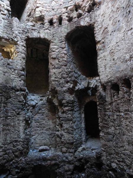 Lo spessore murario impegna 3 m e consente al suo interno lo sviluppo di una scala che, partendo da un livello sottoposto di ca. 1 m all’attuale piano esterno collegava cinque solai lignei di cui rimane traccia solo nei fori di alloggio delle travi. La cappella, accessibile dalla corte, reca sull’ingresso una formella marmorea con croce cuspidata di gusto gotico e, all’interno, un prezioso ciclo di affreschi tardomedievali, troneggiati dal Pantocratore e dall’arme Ventimiglia. Le murature sono tutte in pietrame d’arenaria e, bene osservate, chiariscono la stratificazione dei manufatti; lo stato di conservazione è complessivamente cattivo.